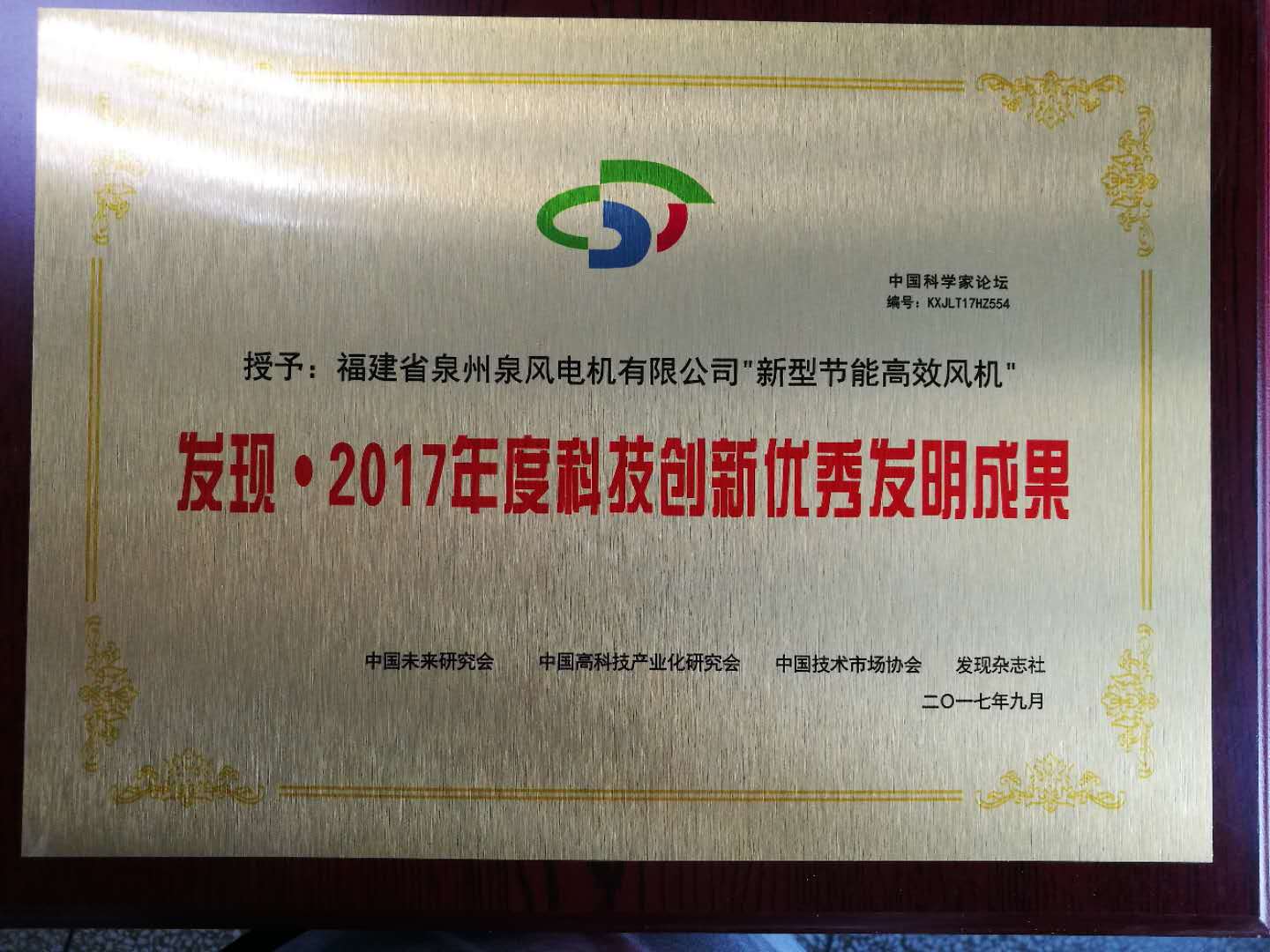 本司以新型節(jié)能高效風機榮獲“發(fā)現(xiàn).2017全國科技創(chuàng)新優(yōu)秀成果獎”