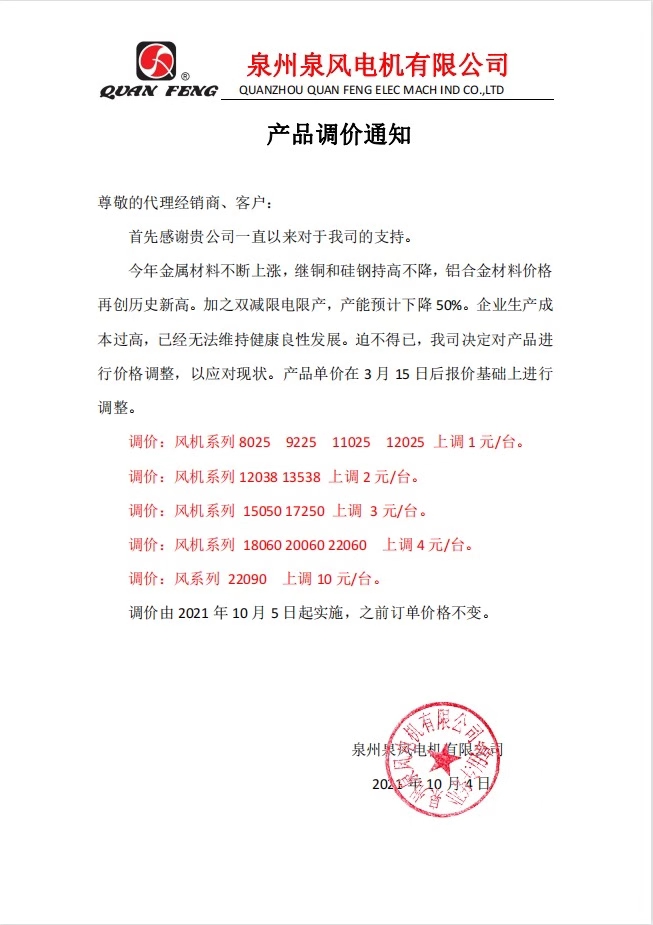 調(diào)價(jià)通知:繼2019年12月及2021年3月調(diào)價(jià)后,10月份再次調(diào)價(jià)